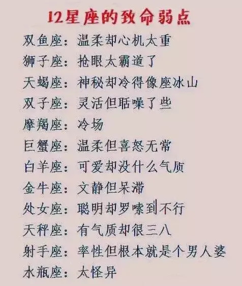 ️双鱼座2.19-3.20 幻想者和爱情者。喜欢沉浸在自己的幻想的世界里面,不注重物质生活,注重精神享受。对待感情是很看重的,会为了自己的爱情甘愿付出一切。但做事喜欢半途而废,很多愁善感的,在感情中很容易感觉到没有安全感。