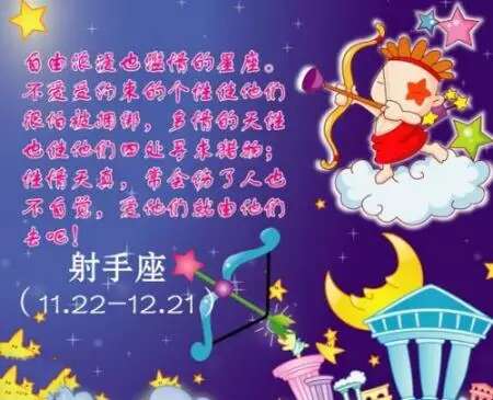 射手座的守护星是木星,守是宙斯,所以射手座的人乐观、诚实、热情、喜欢挑战,不过很容易浮躁不安,鲁莽行事。他是十二宫星座的冒险家,热爱旅行、喜欢性的活动,为人变化多端,有双重性格的特质。