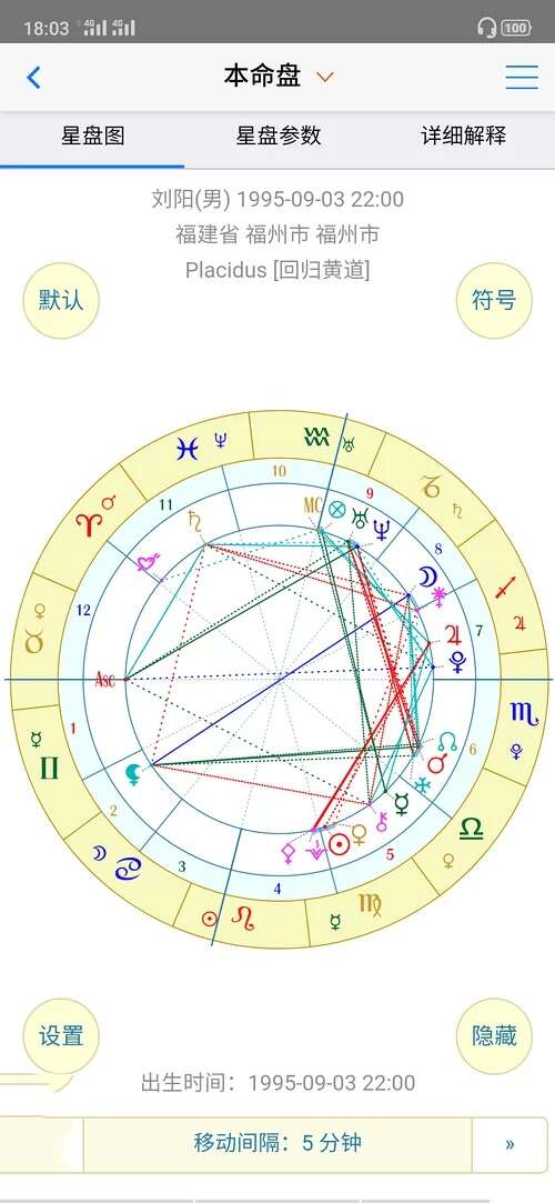 开始看盘:出生年月日,时间输入进去。得到一张星盘(如果你的具体出生时间没有就设置成12点)具体时间没有的话,宫位和月亮星座、上升可能不准。