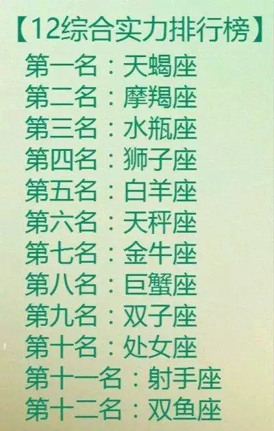 十二星座综合实力排行榜,之一名是天蝎座,第二名是摩羯座,第三名是水瓶座,第四名是狮子座,第五名是白羊座,第六名是天秤座,第七名是金牛座,第八名是巨蟹座,第九名是双子座,第十名是处女座,第十一名是射手座,第十二名是双鱼座。