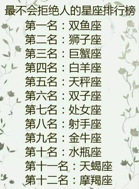 最不会拒绝人的星座,之一名是双鱼座,第二名是狮子座,第三名是巨蟹座,第四名是白羊座,第五名是天秤座,第六名是双子座,第七名是处女座,第八名是射手座,第九名是金牛座,第十名是水瓶座,第十一名是天蝎座,第十二名师摩羯座。