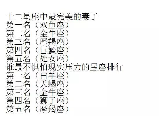 十二星座中最完美的妻子,之一名(双鱼座)、第二名(金牛座)、第三名(摩羯座)、第四名(巨蟹座)、第五名(处女座)。