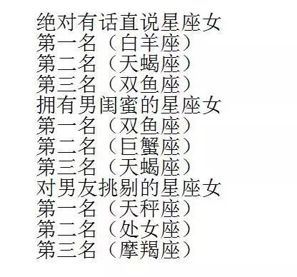绝对有话直说星座女,之一名(白羊座)、第二名(天蝎座)、第三名(双鱼座)。