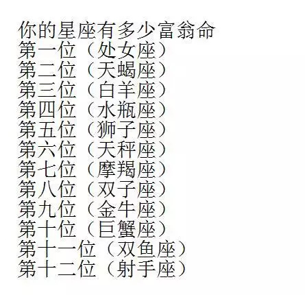 你的星座有多少富翁命,之一位(处女座)、第二位(天蝎座)、第三位(白羊座)、第四位(水瓶座)、第五位(狮子座)、第(天秤座)、第七位(摩羯座)、第八位(双子座)、第九位(金牛座)、第十位(巨蟹座)、第十一位(双鱼座)、第十二位(射手座)。