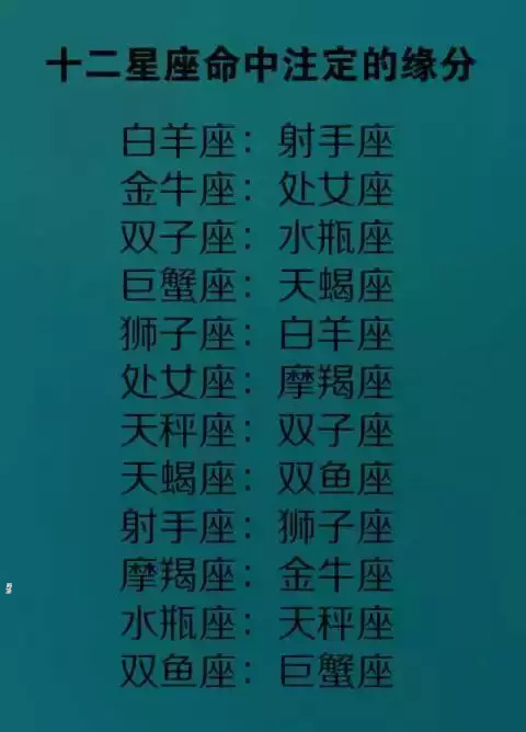 十二星座命中注定的缘分,白羊座和射手座注定在一起,金牛座和处女座是命中注定,双子座和水瓶座是命中注定,巨蟹座和天蝎座是命中注定,狮子座和白羊座是命中注定,处女座和摩羯座是命中注定,天秤座和双子座是命中注定,天蝎座和双鱼座是命中注定,射手座和狮子座是命中注定,摩羯座和金牛座是命中注定,水瓶座和天秤座是命中注定,双鱼座和巨蟹座是命中注定。