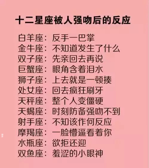 十二星座被人强吻后,白羊座我反手就是一巴掌,金牛座压根不知道发生了什么,双子座先亲回去再说吧,巨蟹座眼角委屈的泪水,狮子座上去揍你一顿,处女座回家后疯狂地刷牙,天秤座整个人都变得僵硬了,天蝎座时刻防备着,射手座不知道如何反应,摩羯座一脸懵逼,水瓶座欲拒还迎,双鱼座娇羞的小眼神看着你。