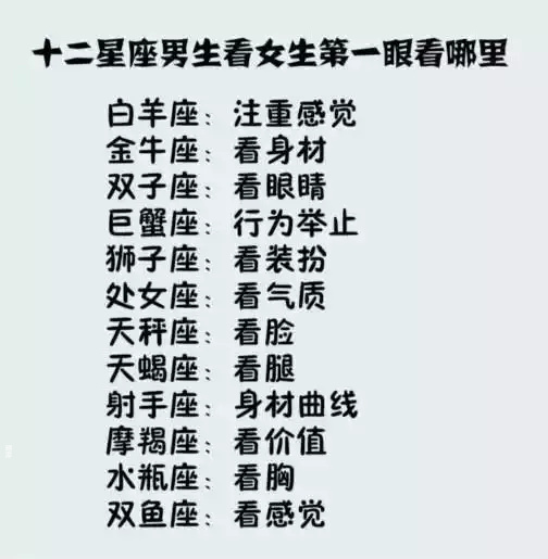 十二星座男生之一眼看到女生,白羊座之一眼看感觉,金牛座之一眼先看身材,双子座之一眼看眼睛,巨蟹座之一眼看对方的行为举止,狮子座之一眼看对方的装扮,处女座之一眼看气质,天秤座之一眼看脸,天蝎座之一眼先看腿,射手座之一眼看身材的曲线,摩羯座之一眼看价值,水瓶座之一眼先看胸,双鱼座之一眼看感觉。