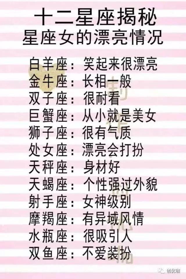 十二星座女的漂亮情况,白羊座的人笑起来很好看,金牛座的人长相一般,双子座的人很耐看, 巨蟹座的人从小就是一个美女,狮子座的人很有气质,处女座的人很漂亮很打扮,天秤座的人身材很好,天蝎座的人个性比外貌重要,射手座的人属于女神级别,摩羯座的人有异域风情,水瓶座的人很吸引人,双鱼座的人不喜欢打扮。