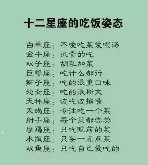 十二星座吃饭姿态,白羊座的人不吃饭只喝汤,金牛座的人专挑贵的吃,双子座的人胡乱的加菜,巨蟹座的人吃什么都行,不挑,狮子座的人口味很重,处女座的人吃饭的时候很斯文,天秤座边吃边擦嘴,天蝎座的人只吃一个菜,射手座的人每一个菜都想尝一尝,摩羯座的人只吃自己眼前的菜,水瓶座的人只要一点点菜,双鱼座的人只吃自己爱吃的。