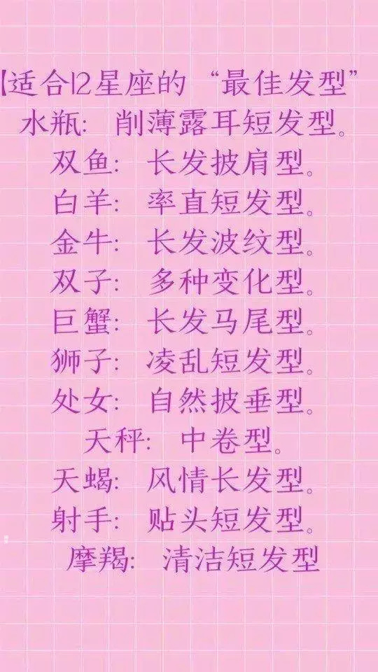 适合十二星座的发型,水瓶座的人适合削薄露耳的短发,双鱼座的人适合长发披肩,金牛座的人适合长发波纹,白羊座的人适合率直短发,双子座的人适合多种发型都适合,巨蟹座的人适合长发马尾,狮子座的人适合的短发,处女座的人适合自然披发,天秤座适合中卷发,天蝎座的人适合风情长发,射手座的人适合贴头短发,摩羯座的人适合清洁短发。