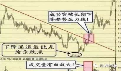 5、股价成功突破下降趋势压力线时的买点。个股经过长时间的大幅下跌,在成交量放大的配合下成功突破长期下降趋势线的束缚,很快出现了大幅上涨的走势,给投资者提供了一次良好的买入机会。(如下图所示)