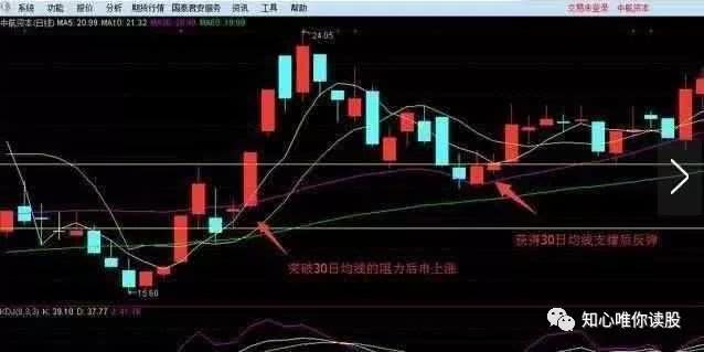 30日均线是一只股票重要的均线,在股价在30日均线下方时,该均线贝成为一个阻力位,但如果股价突破该阻力位的话股价会有一波上涨;当在股价在30日均线上方时为股价的强力支撑线。