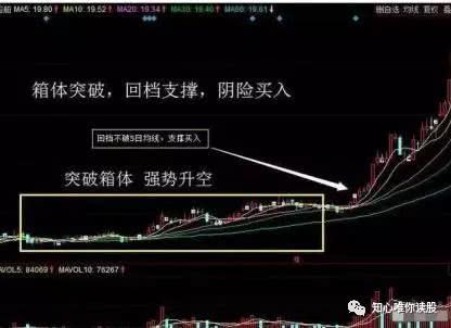 股市的价格在单个箱体内进行调整运行,在某天突破顶端,进而伴随着成交量的放量,散户切记不要追高,等待后期股价回调顶端时阴线买入,回调必是缩小成交量的;